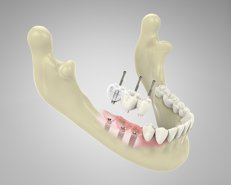 鈦合金和人體組織相容性很高,故目前多數牙醫師所使用的植體材質是與骨頭結合良好的鈦合金,醫師會透過翻瓣手術將人工牙根植入齒槽骨。植入人工牙根後,一般上顎須等六個月,下顎須等至少四個月,齒槽骨與人工植體才會緊密結合,不同的植體表面處理與植入方式可縮短等待時間,這時牙床上還看不到東西,待四至六個月後進行第二步手術,將人工植體的頭露出來,裝上「癒合支台」縫合後即完成,此時在牙床上就可看到東西了,再等一至二個週讓牙齦癒合完整,即可進行第三步驟-在支台上重建假牙。